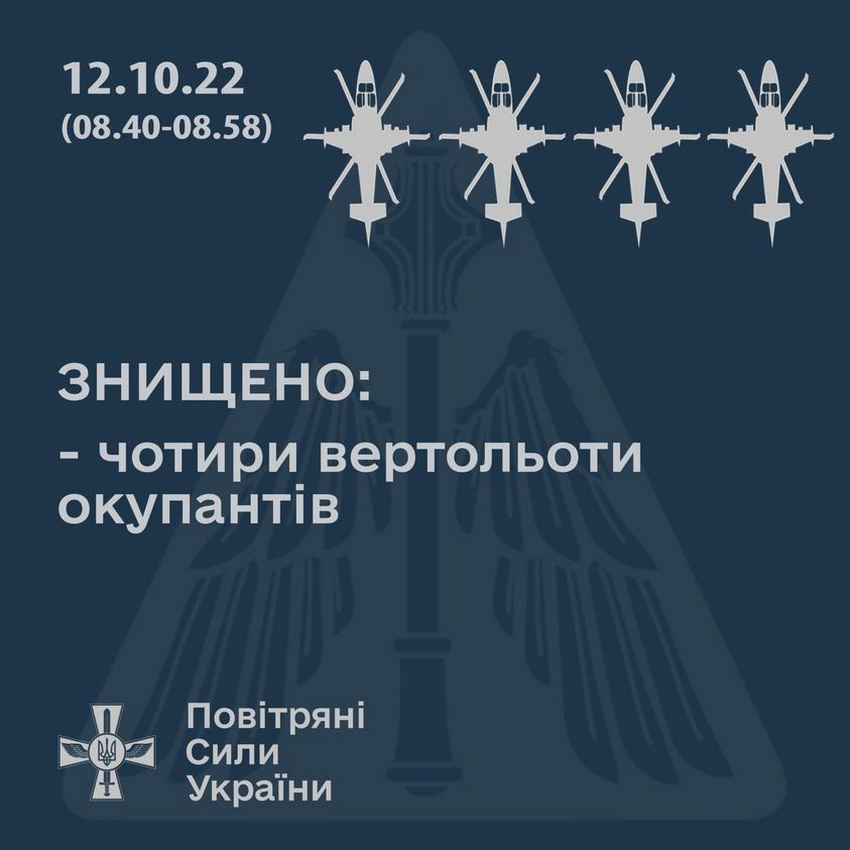 12 жовтня з 8.40 по 8.58 на півдні України зенітними ракетними підрозділами Повітряних Сил знищено щонайменше чотири ударних вертольоти противника (імовірно Ка-52), які здійснювали вогневу підтримку наземних окупаційних військ на південному напрямку.
