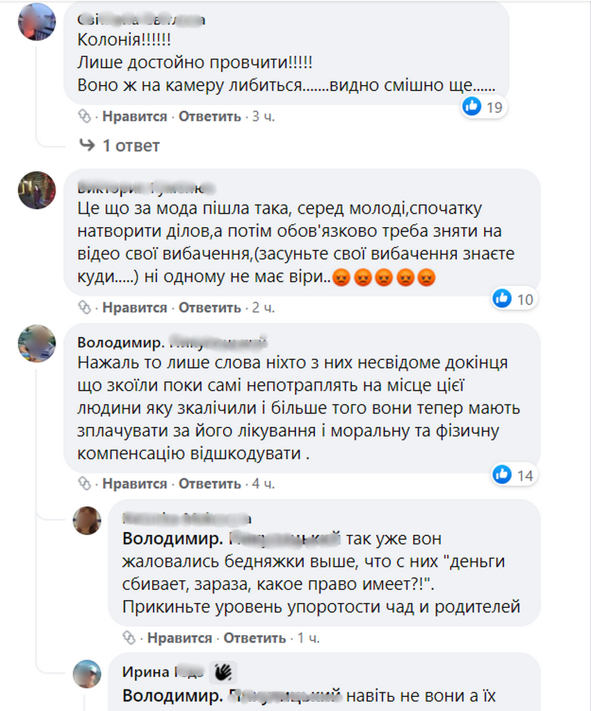 «Що за мода???? Вчиняють злочини, а тоді вибачаються і думають, що їм все зійде з рук...Не повинно так бути. Такі підлітки повинні розуміти, що за злочин буде покарання. Щоб більше рука не піднялась на таке».