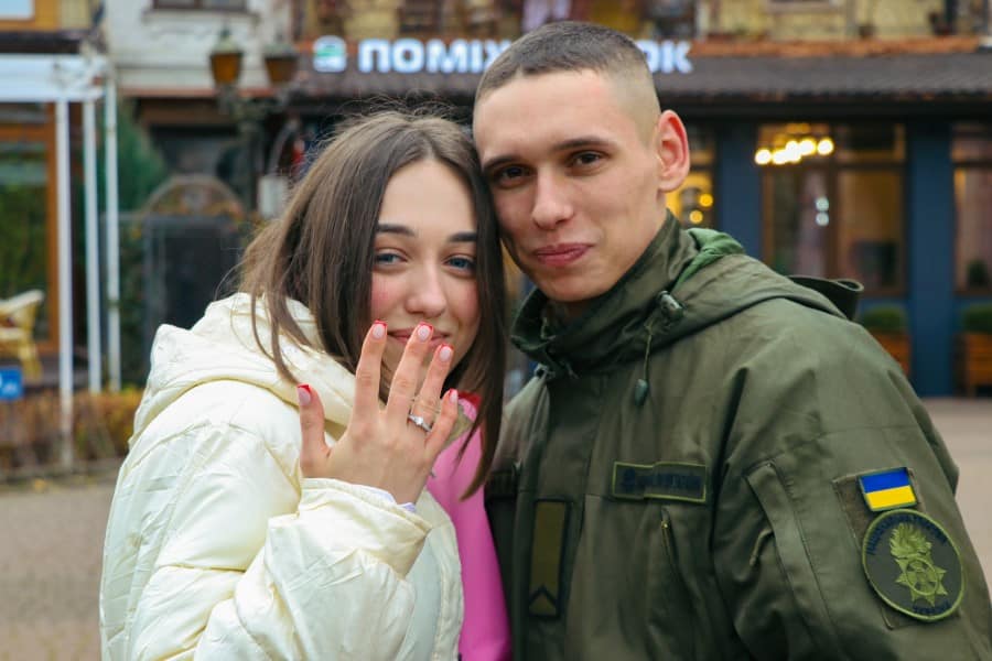 «Нова історія кохання у Вінниці. На фото – закоханні Андрій та Ганна. Він військовослужбовець Нацгвардії, вона – має цивільну професію. Дівчина приїхала з Тернопільщини, щоб побачитись з коханим, і не очікувала, що її зроблять пропозицію руку та серця.