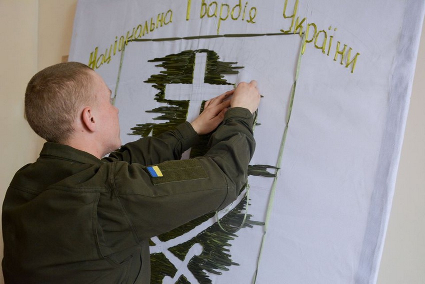 «Зрозумів лиш одне – якщо робити, то робити те, що нас об’єднує. Вирішив вишити герб Вінниці, тільки військову версію. Ця техніка звичайна, називається шов вперед голкою, але замість ниток використав стрічку, стібки стали схожі на вишивку гладдю. Аби герб був контрастний вирішив залишити його кольору основи тобто білим, для чітких країв зробив обшивку контору, потім вишив напис « Національна гвардія України, військова частина 3008», – розповідає солдат строкової служби Назар Чекирда.