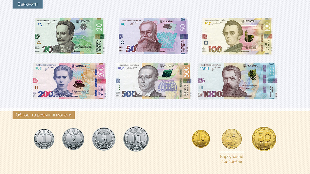 Національний банк введе в обіг монети номіналом 5 та 10 гривень, які поступово замінять паперові банкноти. Водночас буде запроваджено оновлені банкноти номіналом 50 та 200 гривень з удосконаленою системою захисту, які за дизайном наслідують банкноти нового покоління гривні – номіналами 20, 100, 500 та 1000 гривень.