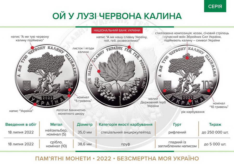 «Під час війни пісня «Ой у лузі червона калина» стала українським символом незламності і гімном мужнього протистояння ворогу. Вона також стала широко відомою за межами України. Як і сотні років тому, суть цієї пісні залишається актуальною й нині – боротьба з московською владою за незалежність України. Тому на знак глибокої поваги та вдячності до українських захисників, а також прагнучи увіковічнити в грошових знаках історичну боротьбу українців за незалежність, ми з гордістю вводимо в обіг ці нові пам’ятні монети», – зауважив заступник Голови Національного банку Олексій Шабан.