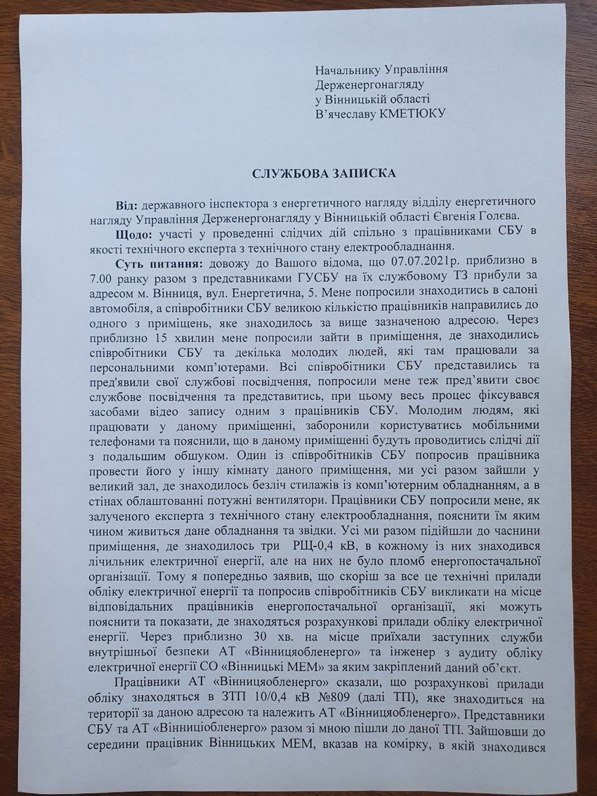 Участь в обшуку брали і працівники Держенергонагляду – державної структури, яка не підпорядковується приватному АТ «Вінницяобленерго». Саме фахівці Держенергонагляду дали висновок, що ніякої крадіжки електроенергії не було