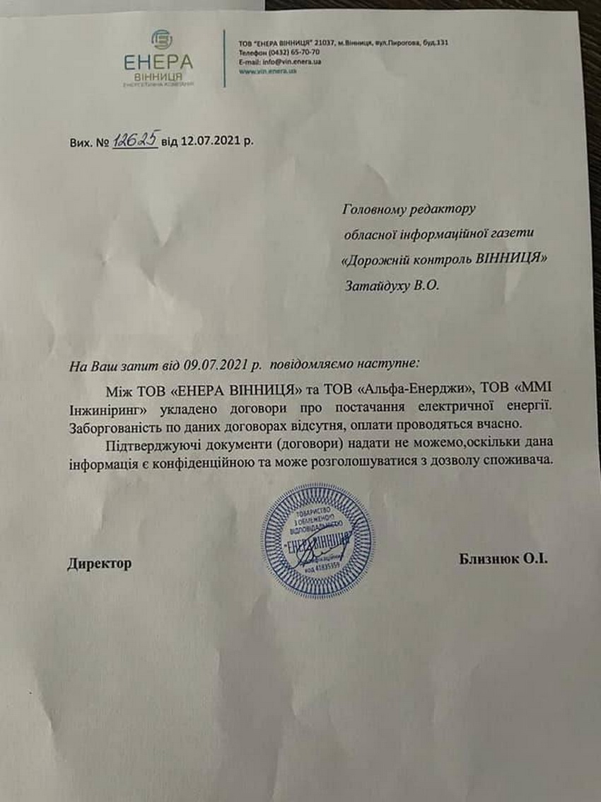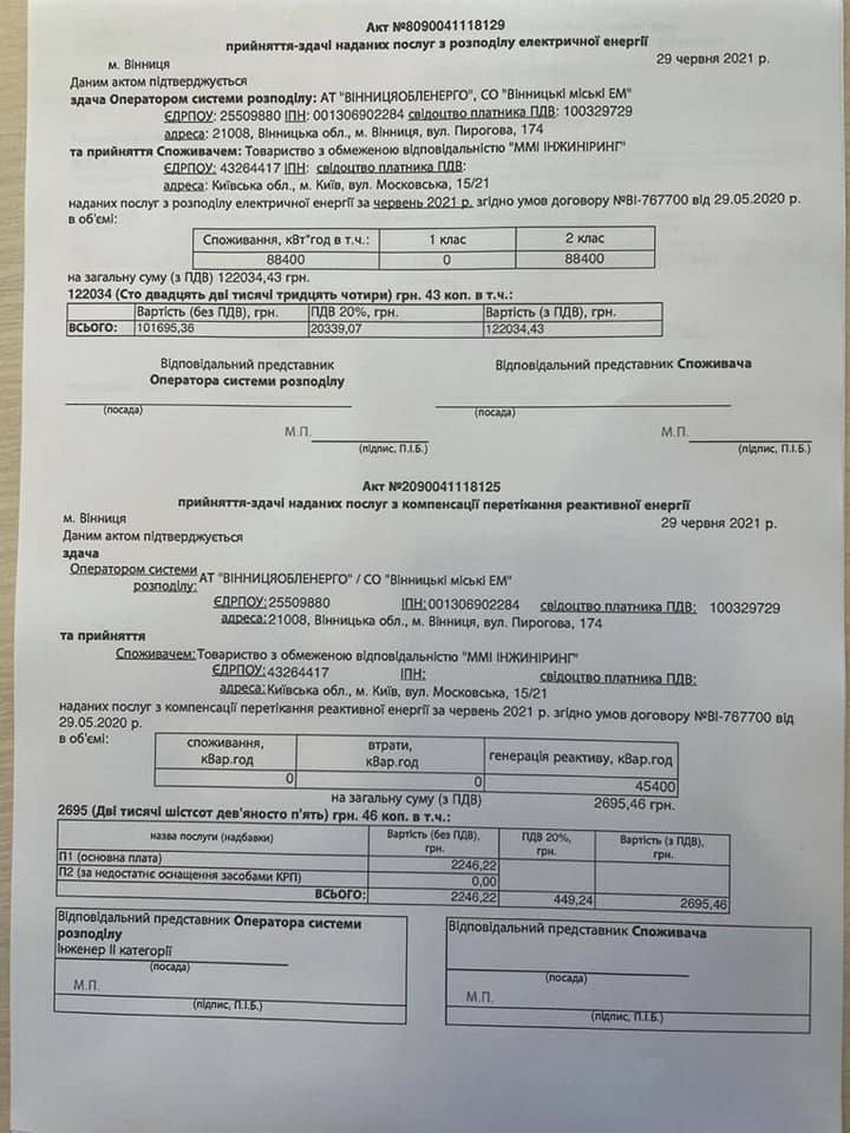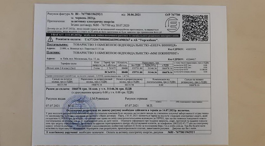 Окрім того, у відповідь на запит ТОВ «ЕНЕРА Вінниця», повідомила, що має договори на постачання електроенергії як з ТОВ «Альфа-Енерджі», так і з ТОВ «ММІ Інжинірінг». Відповідь була однозначною: рахунки за електроенергію сплачуються вчасно, заборгованість відсутня. Також активісти опублікували в соцмережі фото платіжок, які засвідчують, що за «вкрадену» електроенергію лише за минулий місяць було сплачено понад 300 тис грн.