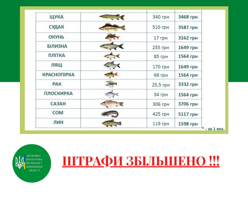 6 жовтня цього року, Кабінет міністрів України на засіданні схвалив підвищення штрафів за незаконний вилов риби. До прикладу, на карася сріблястого у 93 рази, у 130-ть за раків. Найбільше оцінили окуня. Штрафні санкції на нього збільшилися в 186 разів. Якщо раніше за таку рибину треба було б сплатити 17 гривень, то тепер, цілих 3162 гривень.