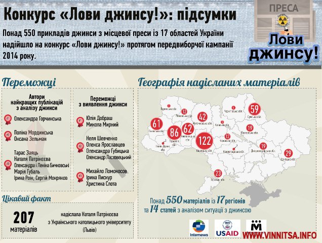 Всього на конкурс було надіслано понад 550 прикладів джинси з місцевих друкованих та інтернет-видань із 17 областей України.