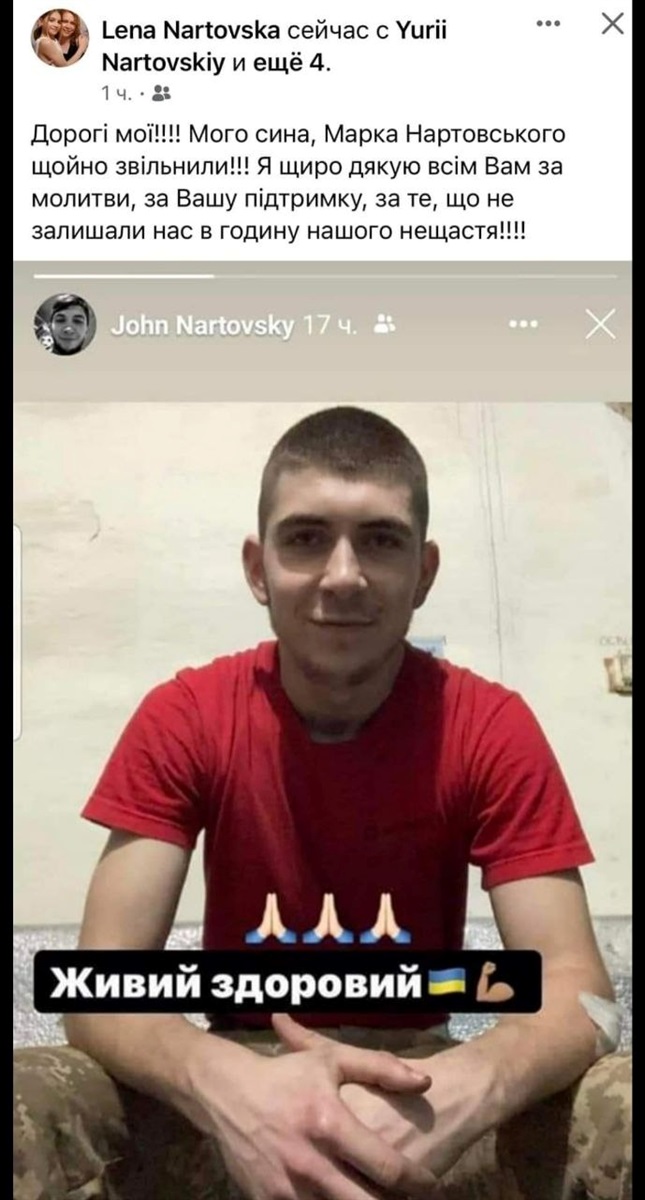 Інформацію про повернення героя підтвердила мама Марка – Олена Нартовська, опублікувавши допис у соціальних мережах.