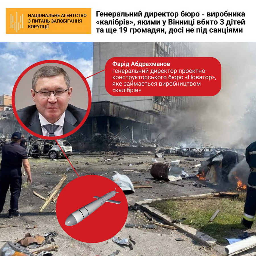Генеральний директор проектно-конструкторського бюро «Новатор» Фарід Абдрахманов, зброєю якого 14 липня у Вінниці було вбито людей, досі не під санкціями.
