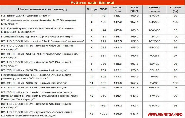 Інформaційним освітнім ресурсом «Освітa.ua» склaдено рейтинг зaгaльноосвітніх шкіл Вінниці, що посіли нaйвищі місця у рейтингу шкіл Укрaїни зa підсумкaми ЗНО 2018 року.