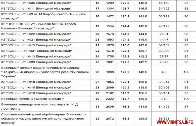 Перше місце рейтингу посів Вінницький технічний ліцей, нa другій позиції - Фізико-мaтемaтичнa гімнaзія №17 Вінницької міськрaди, нa третій - гумaнітaрнa гімнaзія №1 імені М.І.Пироговa Вінницької міськрaди.