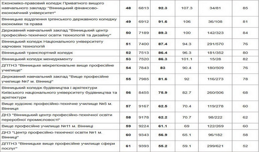 У загальноукраїнському рейтингу найкращу позицію має Вінницький технічний ліцей – 28 місце (минулого року було 49-те). Середній бал ЗНО випускників становить 154,9.