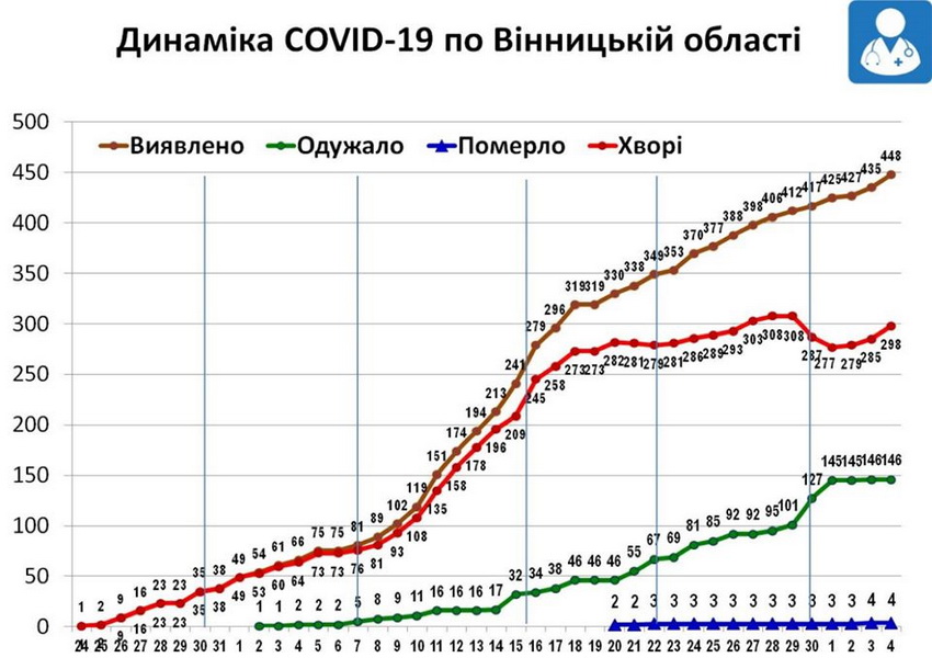Станом на 11 годину ранку 4 травня у Вінницькій області підтверджено 448 випадків захворювань на коронавірус, в тому числі у 28 дітей (місто Вінниця – 16, Гайсинський райони - 4, Вінницький район- 2, Барський, Калинівський, Літинський, Томашпільський, Тростянецький, Чернівецький райони по 1 дитині).