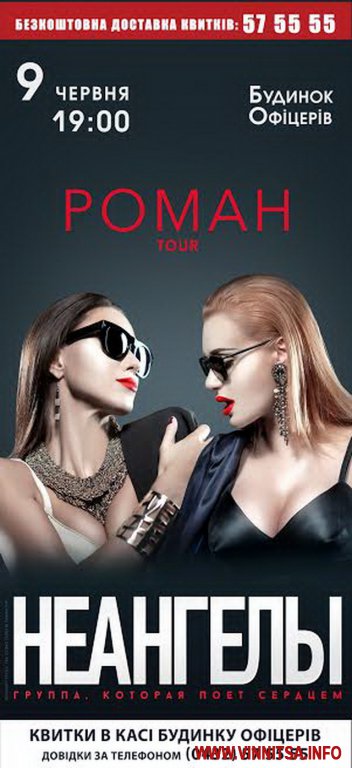 В честь юбилея «НеАнгелы» создали феерическую концертную программу «РОМАН TOUR», с которой посетили множество городов Украины и Беларуси. А уже скоро приедут и к своим винницким поклонникам. Большой сольный концерт группы «НеАнгелы» в Виннице пройдет во вторник, 9 июня, в 19.00 в Доме офицеров. Организаторы гарантируют всем пришедшим море удовольствия и приятных сюрпризов!