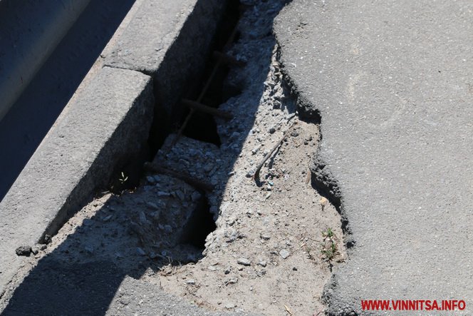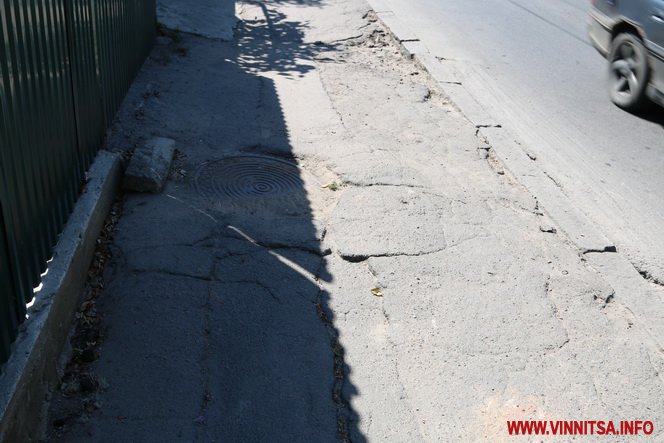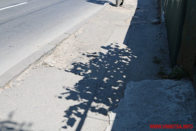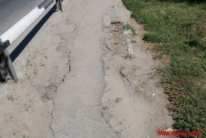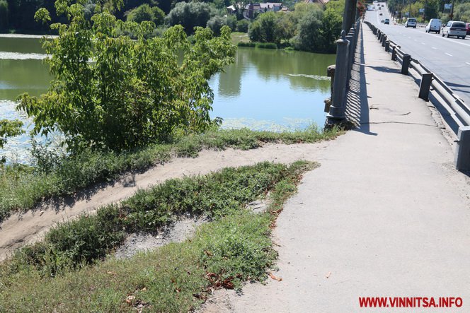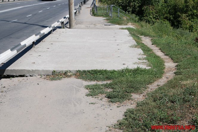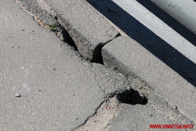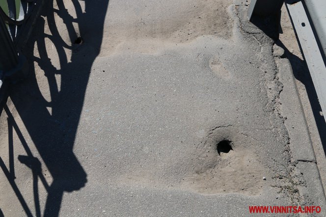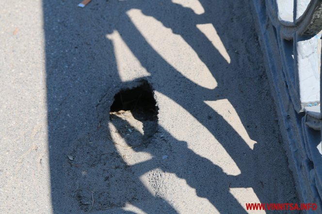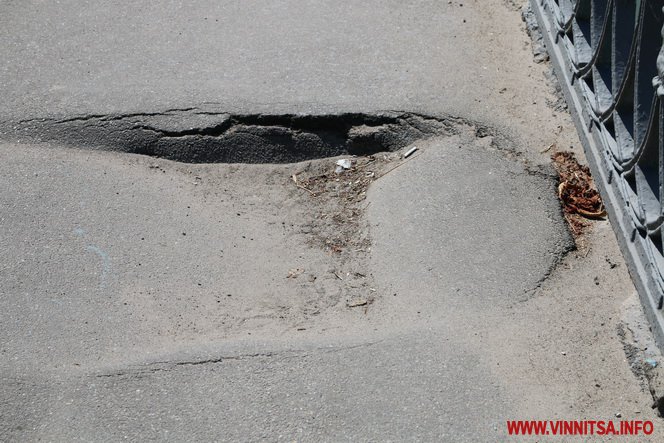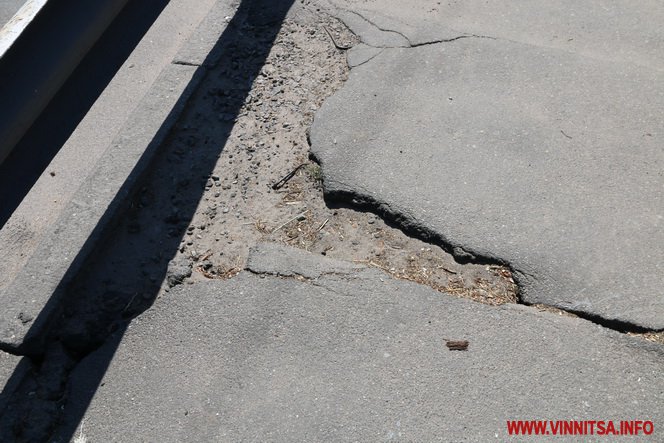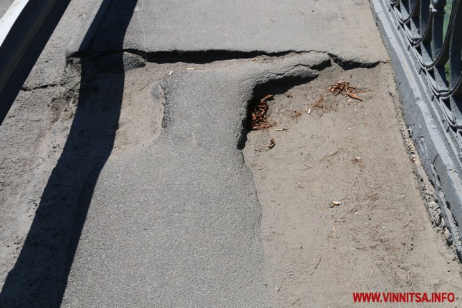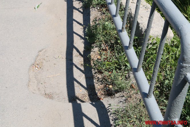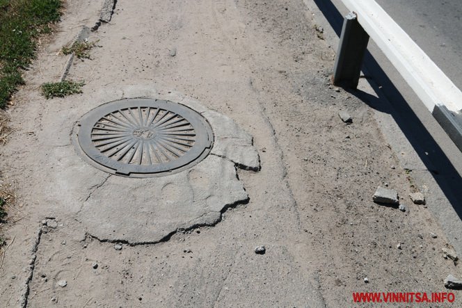 Вінничанам, які вирішили прогулятися Київським мостом, варто бути дуже обережними. Численні діри, ями, привідкриті люки і різкі обриви – ось з чим стикнуться городяни. Зі сторони «Кумбар» ситуація ще гірша: 200 метрів тротуару буквально в аварійному стані. Деякі ділянки не мають асфальтного покриття. Сама ж доріжка латана-перелатана.