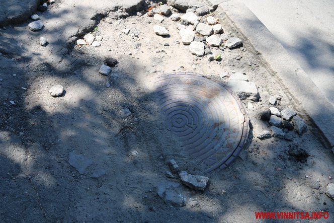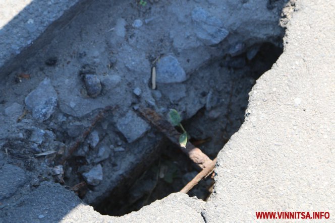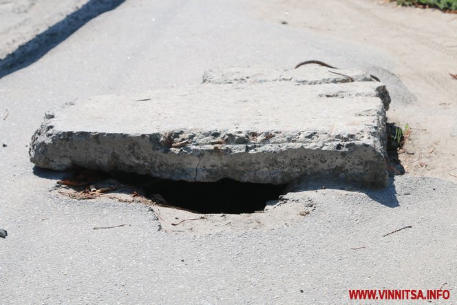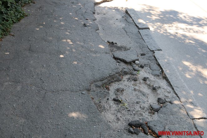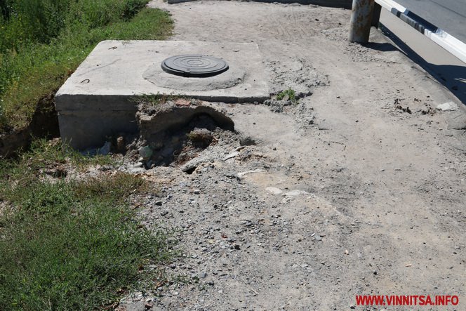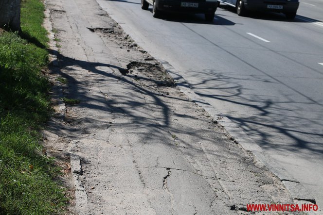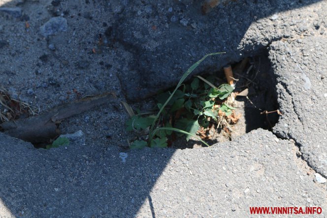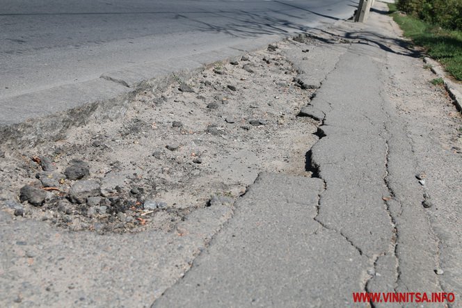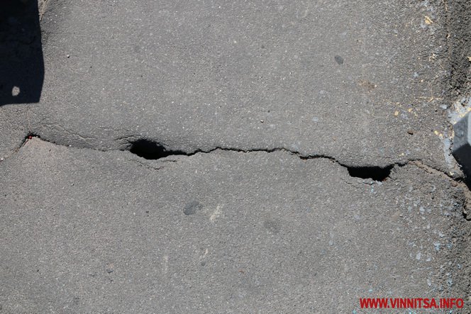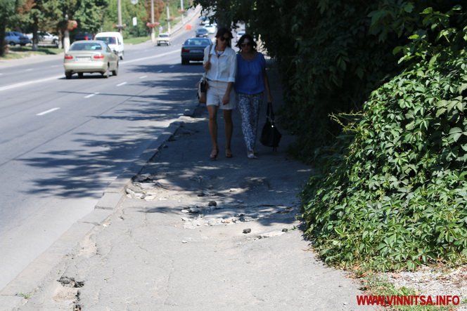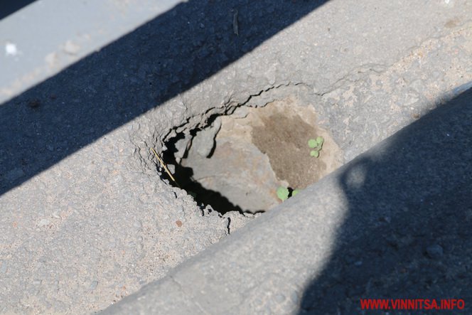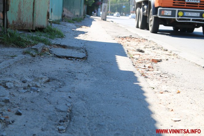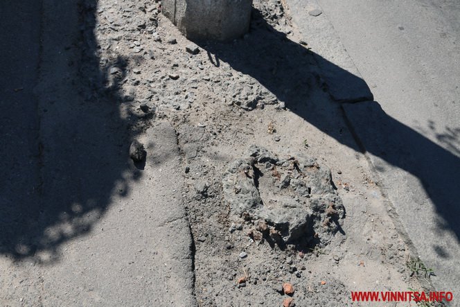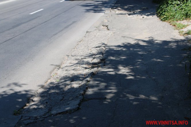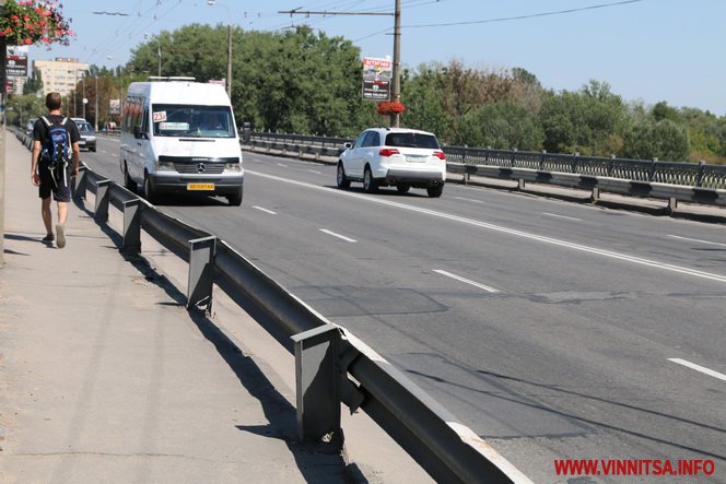 Вінничанам, які вирішили прогулятися Київським мостом, варто бути дуже обережними. Численні діри, ями, привідкриті люки і різкі обриви – ось з чим стикнуться городяни. Зі сторони «Кумбар» ситуація ще гірша: 200 метрів тротуару буквально в аварійному стані. Деякі ділянки не мають асфальтного покриття. Сама ж доріжка латана-перелатана.