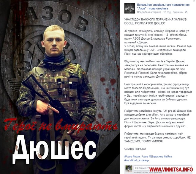 У боротьбі за незалежність загинув ще один Вінничанин. 30 травня, захищаючи селище Широкине, Владислав Романович з позивним Дюшес отримав поранення несумісні з життям.
