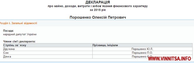 Олексій Порошенко (член депутатської фракції БПП), який був обраний народним депутатом по 12 виборчому округу Вінницької області, задекларував 77 212 гривень доходу у 2015 році, який повністю складає зарплата обранця. Минулоріч статки сина Президента були більшими – 115,5 тисяч гривень.