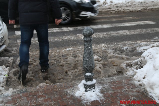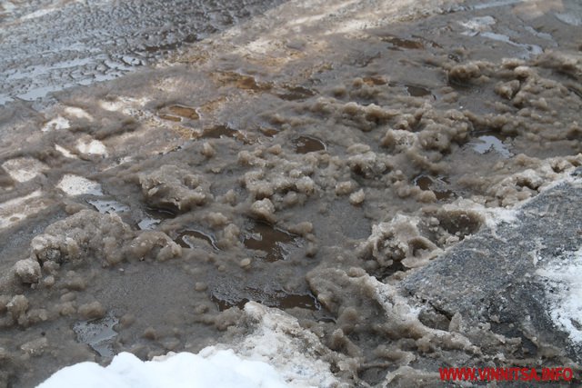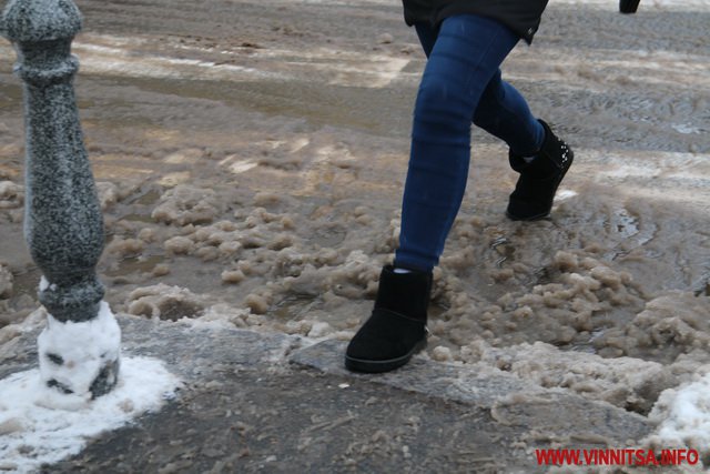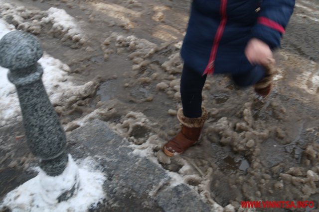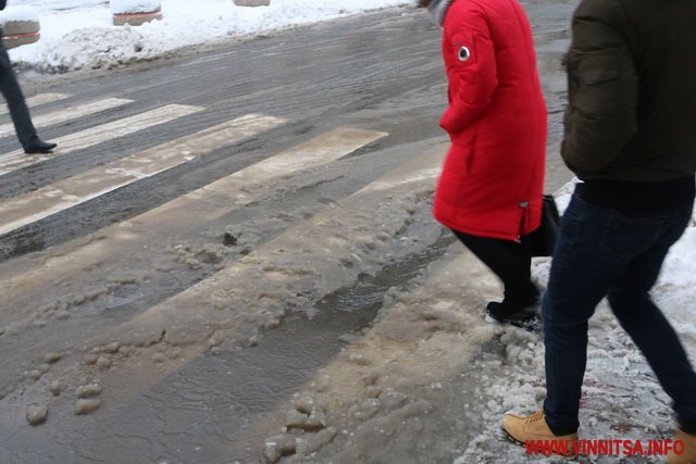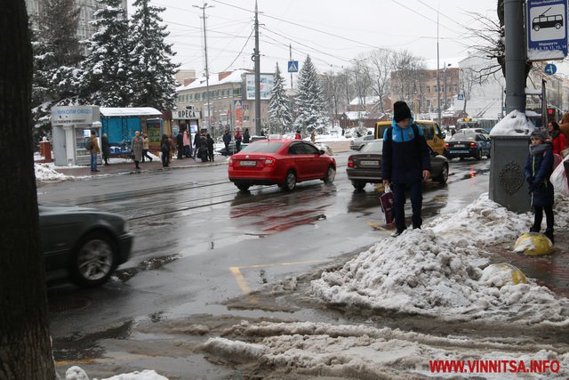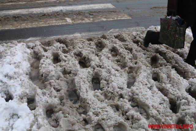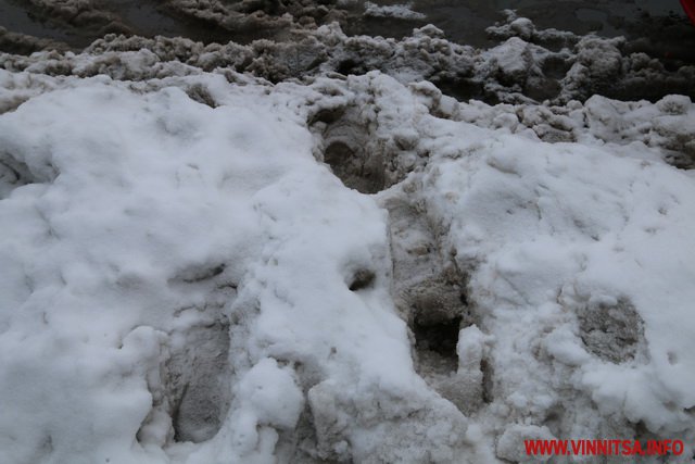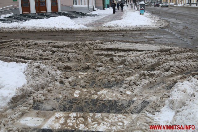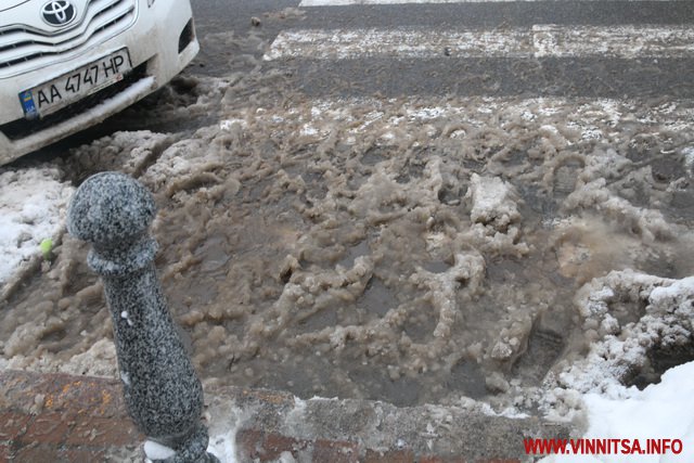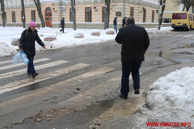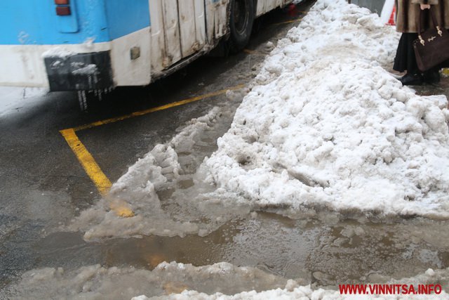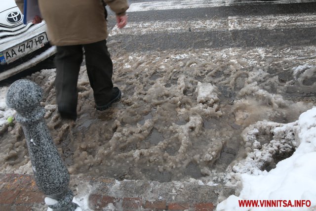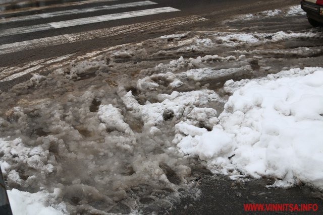 З початку снігопаду у Вінниці комунальники чистять дороги. Але люди жаліються на воду і снігову «кашу» на пішохідних переходах. Калюжі перестрибнути неможливо, на деяких зупинках виходячи з транспорту городяни одразу стрибають у снігову «кашу». Висота якої може сягати 20-30 сантиметрів.