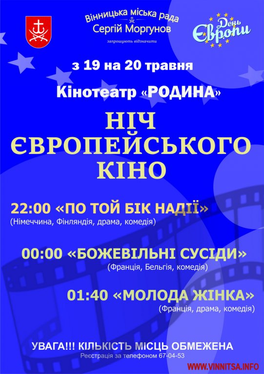 Для участi у проектi «Нiч європейського кiно» у кiнотеатрi «Родина» потрiбно обов’язково попередньо зареєструватись за телефоном: 67-04-53.