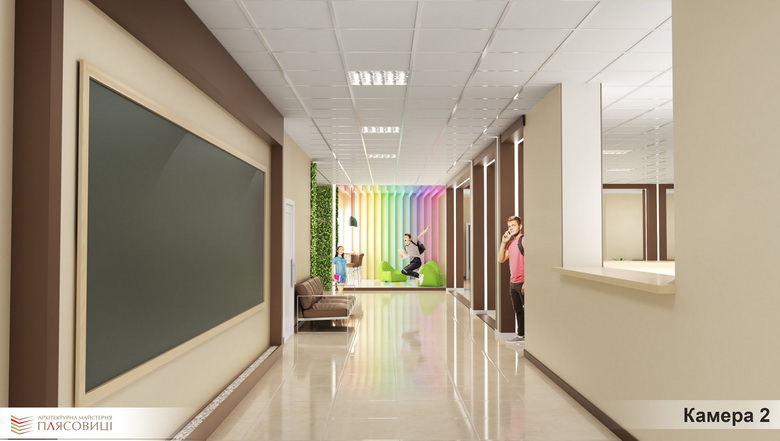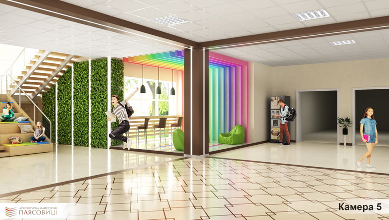 Ми хочемо бачити його у світлих тонах. Трішки солодко-шоколадних фарб для контрасту і підкреслення форм холу. Трішки еко-дизайну і кольорових куточків для яскравого настрою. Запропонована багатофункціональна зона, в якій дитина зможе відпочити, поспілкуватися з друзями, почитати або пограти в «Твістер».