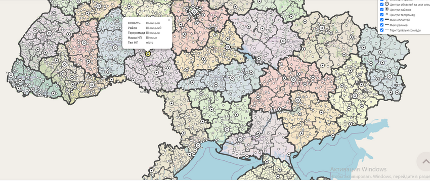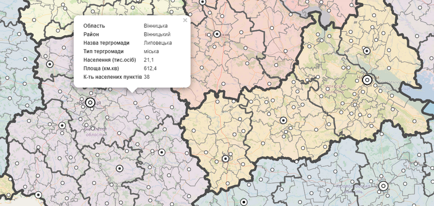 На Атласі можна переглянути інформацію, про кількість населення в громаді, площу громади, кількість населених пунктів, які входять до складу громади. Також видно межі областей, районів і громад.