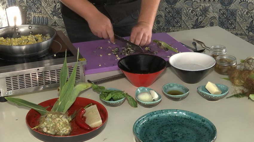 «Просто рис змінимо на кукурудзу та деяких інгредієнтів, щоб підкреслити це саме смак цієї кукурудзи. У пательні смажаться: цибуля, часник, сира кукурудза та її трюфелі. Додають вершкове масло і будь-який бульйон. На смак воно схоже на печериці. Є виражений грибний смак, але такого яскравого-яскравого, як у трюфеля самого оригінального, такого смаку немає», - пояснює кулінар.