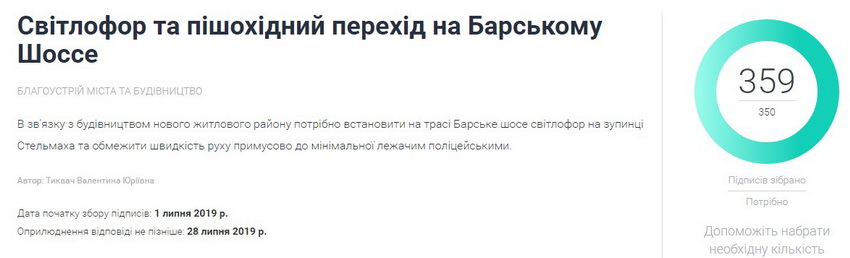 «В зв'язку з будівництвом нового житлового району потрібно встановити на трасі Барське шосе світлофор на зупинці Стельмаха та обмежити швидкість руху примусово до мінімальної лежачим поліцейськими», – йшлося в петиції Валентини Тиквач, яка зібрала 359 підписі із 350 потрібниї.