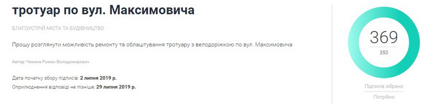 На Максимовича вінничани просили відремонтувати та облаштувати тротуар з велодоріжкою. Петиція зібрала 369 підписів із 350 потрібних.