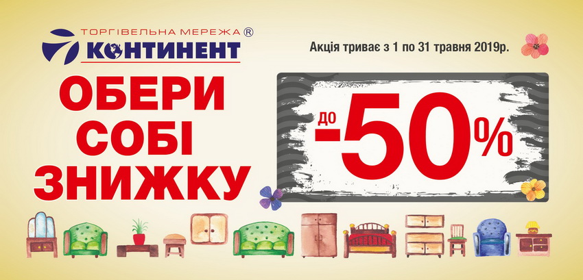 Колектив «7 континенту» - професіонали, які динамічно розвиваються і вважають, що красиві та якісні меблі повинні бути доступними всім і саме для реалізації цієї мети в магазині щомісяця діють акції. Так, наприклад, з 01 травня по 31 травня діє акція «Обери собі знижку». Умови дуже прості – купуєте меблі і маєте можливість отримали знижку до – 50 %!