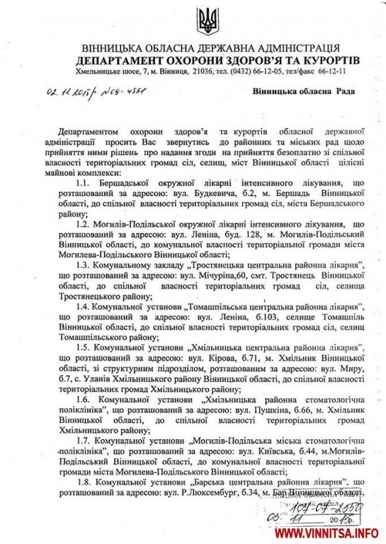 Департамент охорони здоров’я та курортів обласної державної адміністрації просить обласну Раду звернутись до районних та міських рад щодо прийняття ними рішень про надання згоди на прийняття безоплатно зі спільної власності територіальних громад сіл, селищ, міст Вінницької області до комунальної власності районів цілісних майнових комплексів районних лікарень.