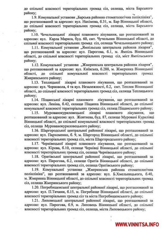 Нагадаємо, що рішенням Координаційної ради з питань місцевого самоврядування при голові Вінницької обласної Ради «Про стан та ефективність використання майна об’єктів спільної власності територіальних громад сіл, селищ, міст області» від 8 жовтня цього року Департаменту охорони здоров’я та курортів обласної державної адміністрації (Бабій Т.Ф.), управлінню спільної комунальної власності територіальних громад Вінницької області (Федоришин В.С.) було рекомендовано підготувати та внести на розгляд сесії обласної Ради проект рішення про передачу зі спільної власності територіальних громад сіл, селищ, міст Вінницької області до комунальної власності районів цілісних майнових комплексів окремих медичних установ.