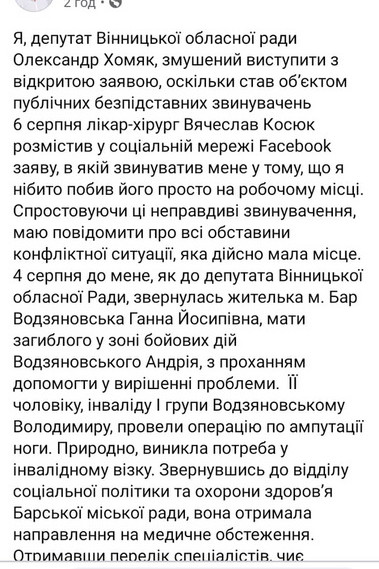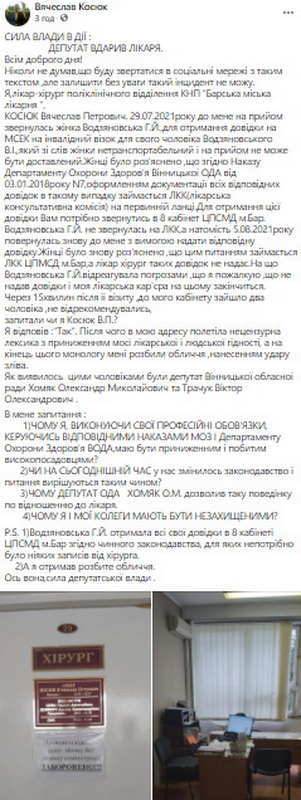 Депутат обласної ради теж написав допис на своїй сторінці в Фейсбук. Він зазначає, що часу на бюрократичне листування не було, тому вирішили з’ясувати обставини справи на місці. Разом з тим він пише, що лікаря не бив.