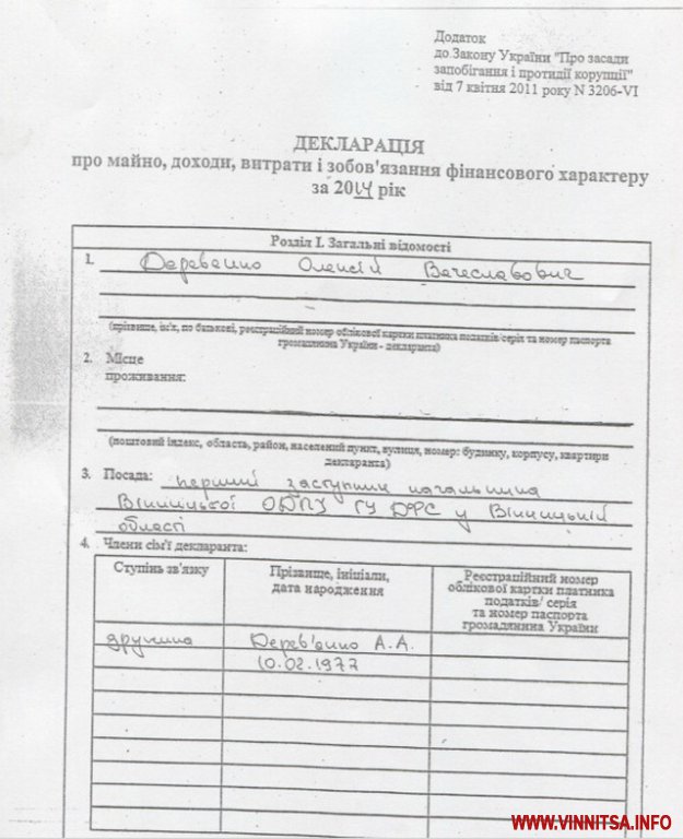 «Заступник начальника Вінницького ОДПІ - начальника Вінницького відділення Дерев'янко Олексія В'ячеславовича та одного члена його сім'ї. Загальна сума доходів декларанта склала 50076 грн, членів сім'ї - 47213 грн. У власності, оренді чи користуванні декларанта перебувають: квартира загальною площею - 52,4 кв.м. Транспортні засоби, що перебувають у власності, оренді чи на іншому праві користування декларанта: автомобіль Порш Каєн 2006 року випуску», - було зазначено в повідомленні відділу взаємодії із ЗМІ та громадськістю ДПС у Вінницькій області.