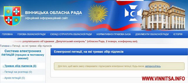 На сайті Вінницької облради створять розділ електронних петицій. Електронні петиції, які формуватимуть громадяни, повинна стосуватись питань, які відносяться до компетенцій та повноважень ради. Петицію оприлюднюють протягом двох робочих днів, з дня її створення автором