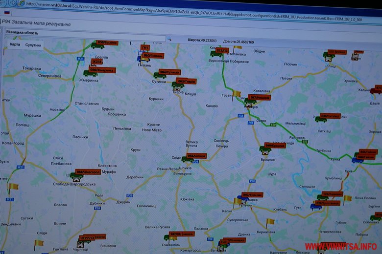 В диспетчерській є загальна карта реагування, вона дозволяє бачити в реальному часі, де в якому місці і які саме бригади знаходяться. Зеленим кольором позначено вільні бригади, синім – зайняті. Прапорці на карті – реальні виклики.