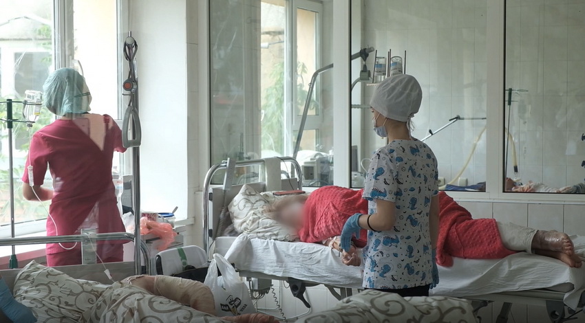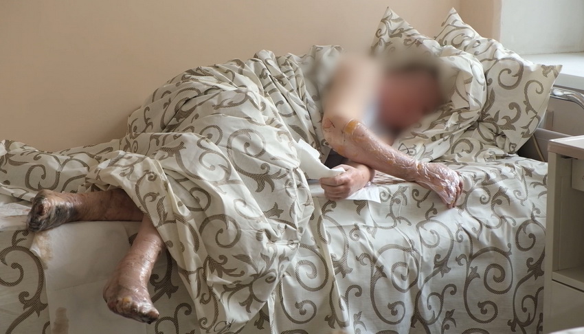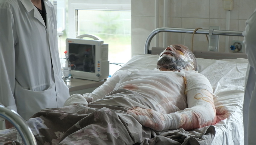 «У дівчини 98% опіків поверхні тіла, плюс опік дихальних шляхів. На сьогоднішній день вона знаходиться на дихальному апараті. Стан у дитини вкрай важкий. Лікування зараз проводиться симптоматичне. Остальні хворі, 30-40-50-60% опіків, вони теж важкі, але не такі, вкрай важкі. На сьогоднішній день планується частина хворих, це дві жінки, які підуть в операційну, в яких площа опіків 10-15%. Сьогодні будемо оперувати.