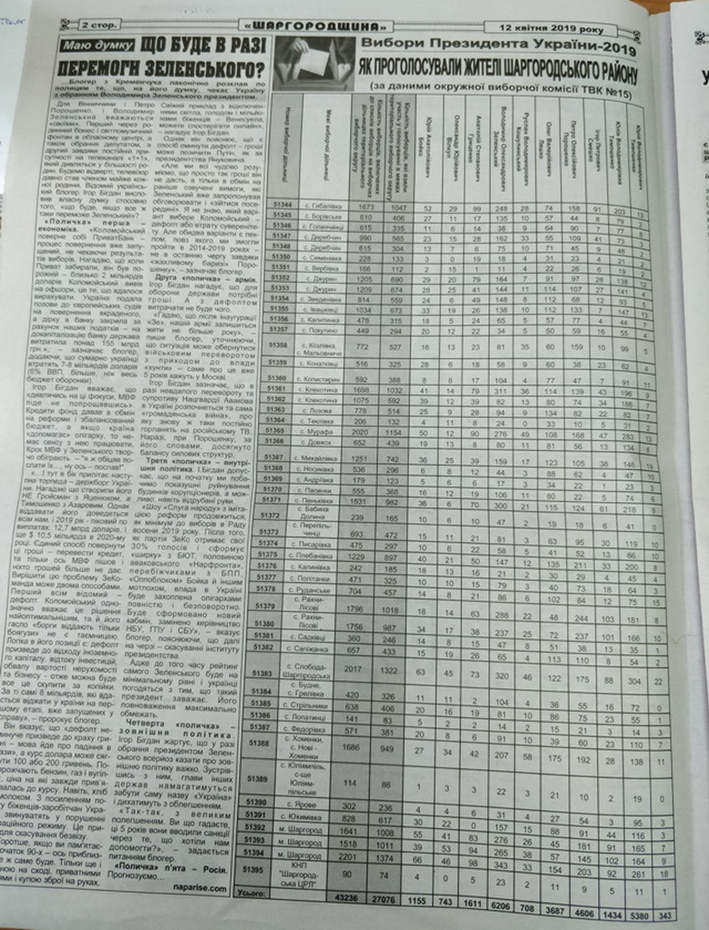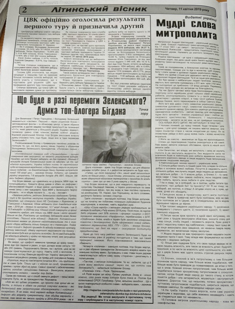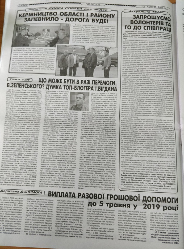 Низка районних газет області опублікувала статтю під заголовком «Що буде в разі перемоги Зеленського? Думка топ-блогера Бігдана», яка може містити певні ознаки замовності проти кандидата на посаду Президента України Володимира Зеленського.