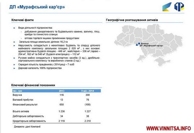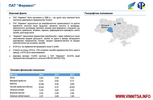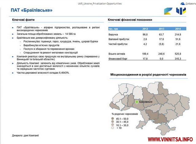Мінеконорозвитку опублікувало маркетингові матеріали про державні підприємства, які включено до списку на приватизацію в 2015 році. Із понад двох сотень підприємств, 4 – розташовані у Вінницькій області: ПАТ «Браїлівське», ПАТ «ДТЕК Західенерго»; ДП «Мурафський кар’єр»; ПАТ «Фермент».