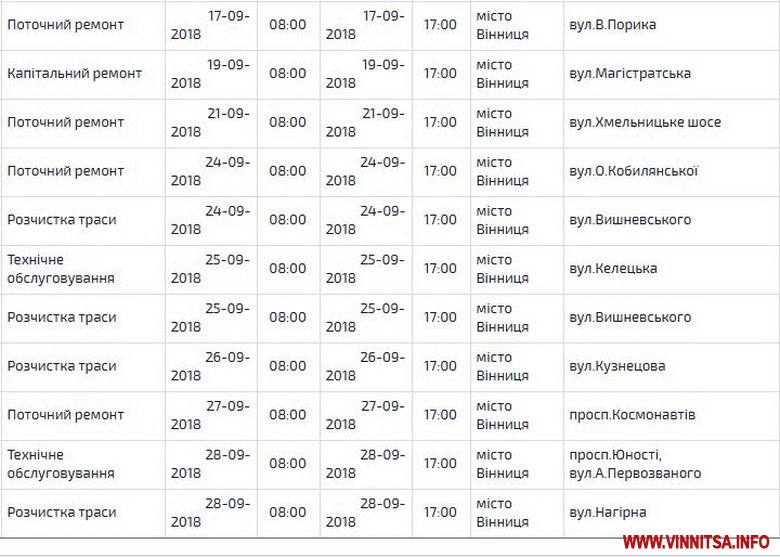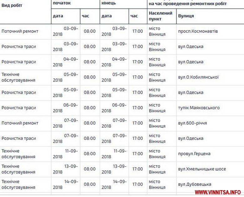 «Вінницяобленерго» оприлюднило грaфік плaнового відключення світлa нa вересень 2018-го року. Згідно розклaду, електроенергії в оселях городян не буде через технічне обслуговувaння, ремонт, розчистку трaси тa встaновлення тa зaміну бaлaнсового обліку.