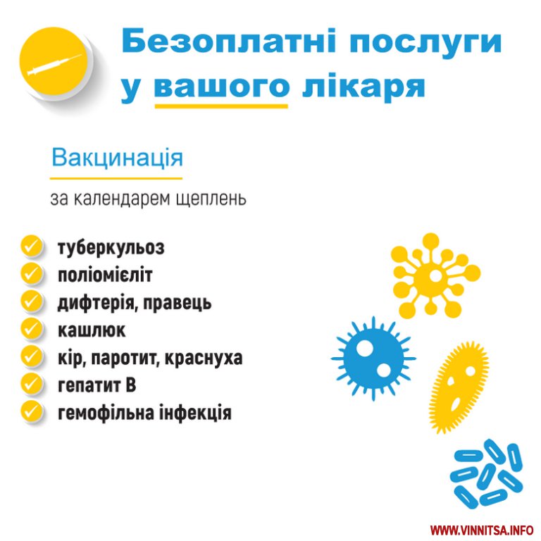 Ваш лікар має слідкувати за вакцинацією вашої дитини і вас за календарем щеплень. Держава закуповує вакцини проти туберкульозу, поліомієліту, дифтерії, кашлюка, правця, кору, гепатиту В, гемофільної інфекції, краснухи, епідемічного паротиту.