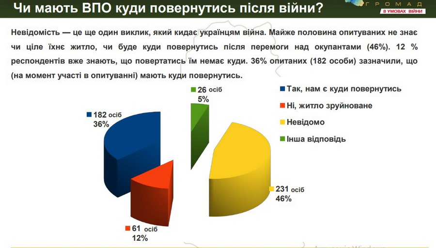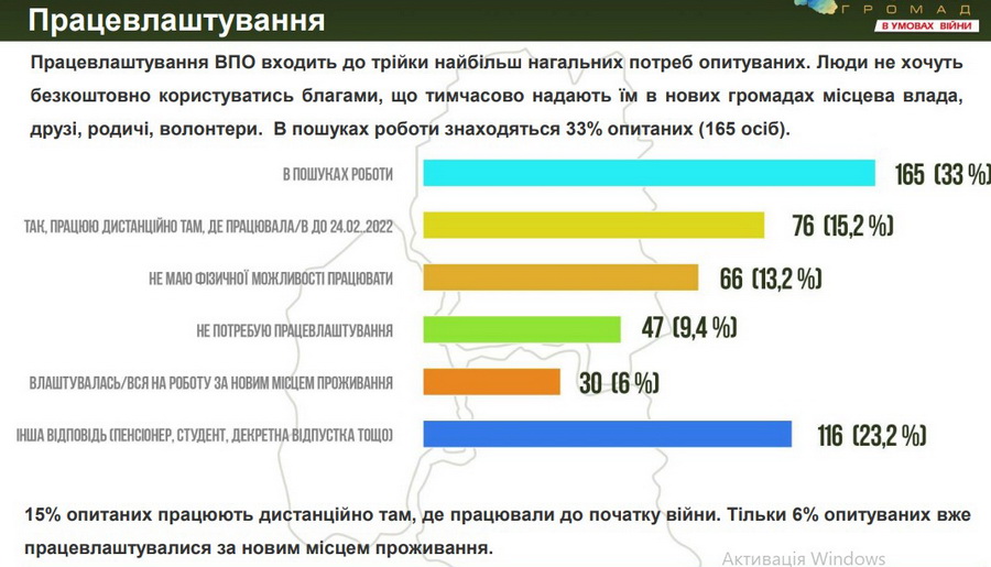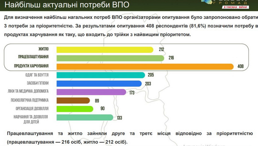 Для визначення найбільш нагальних потреб ВПО організаторами опитування було запропоновано обрати 3 потреби за пріоритетністю. Перелік потреб, із яких пропонувалось обрати: житло, продукти харчування, працевлаштування, одяг та взуття, засоби гігієни, ліки та медична допомога, психологічна підтримка, організація дозвілля для дорослих та дітей.
