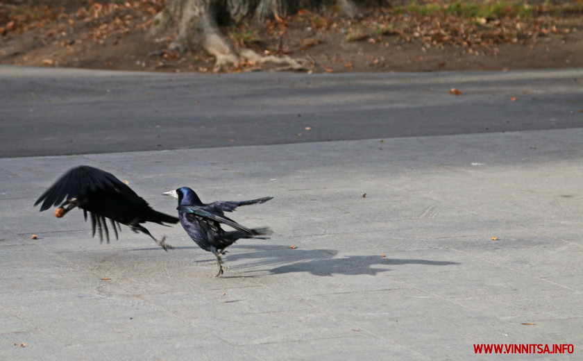 У Центральному парку ще лежить жовте опале листя, яке у мішки збирають комунальники. Також у парку багато птахів – голуби, ворони та горобці. Усі вони шпортаються у сухому листі, шукають там щось поїсти. В озері біля парку плавають качки, яких фотографують усі перехожі. Безпритульні собаки притулилися до стін будівель і гріються на сонечку, або бавляться на траві.
