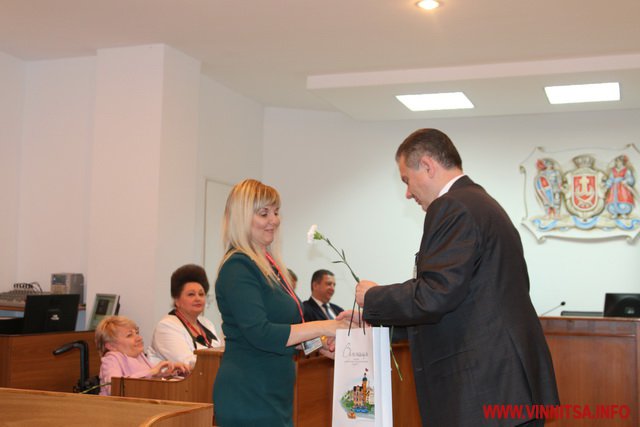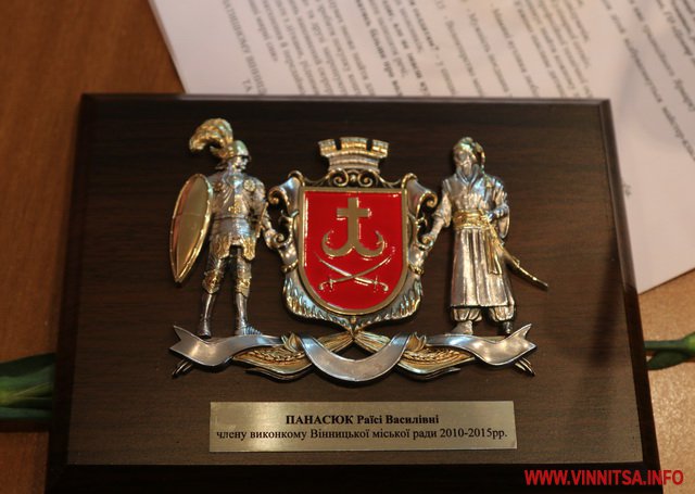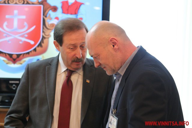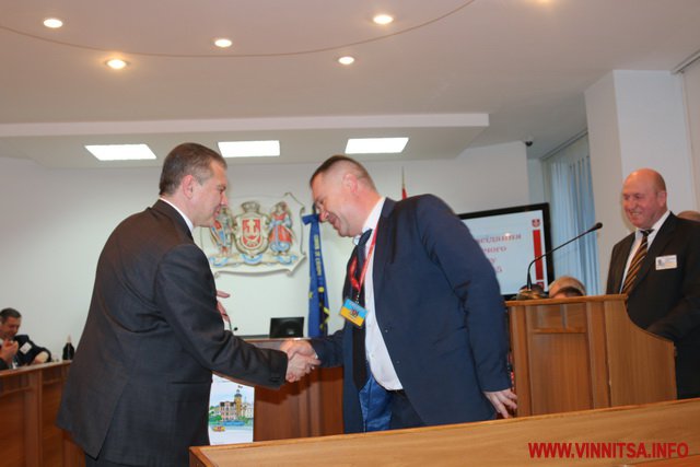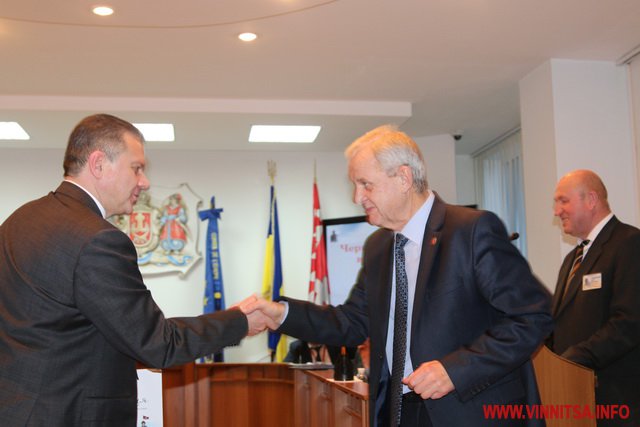 «Іменні» сувеніри із зображенням герба Вінниці вручили Сергію Моргунову та передали для Володимира Гройсмана.