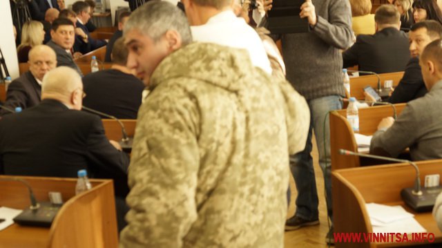 Після звіту Сергія Моргунова до мікрофону в залі пішов місцевий активіст, який проти бюджетних видатків – Петро Гандурський. Він почав говорити про витрати, його попросили не зривати засідання, але чоловік вперто мовив своє. Тоді двоє АТО-вців підійшли до Гандурського з словами «не зривай сесію» попід руки почали виводити його з залу. Вже біля дверей, що на вихід в коридор, зчинились сутички між активістами і АТО-вцями. Мер Вінниці весь час просив заспокоїтись і говорив, що всі матимуть слово, хто бажає виступити, але є правила та регламент.