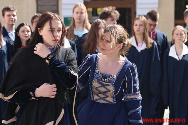 На площі Тараса Шевченка студенти показали міні-виставу про створення Острозької академії. Автентичний одяг, хор та історичні образи «перенесли» глядачів у XVI століття.