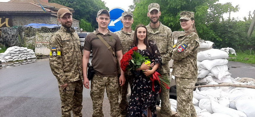 Закохану пару розділяли сотні кілометрів. Ірина їхала з друзями із Черкас до Вінниці, аби побачитися із своїм хлопцем, зв’язківцем з позивним «Джоні». Але на блокпості на неї чекала несподіванка. Військові зупинили автівку, наказали всім вийти та почали перевіряти документи. В цей момент із букетом квітів та обручкою у руках біля машини з’явився тероборонівець.
