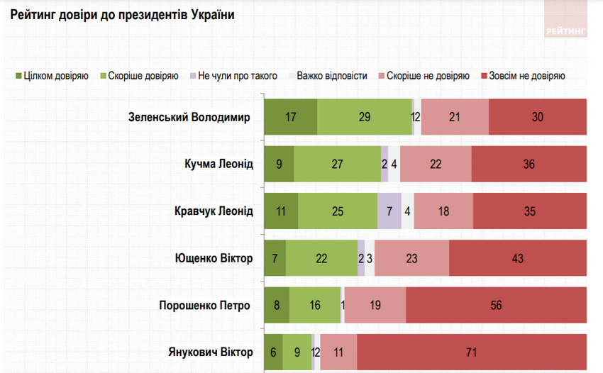 Володимиру Зеленському довіряють – 46%, не довіряють – 51%. Л. Кучмі довіряють 36%, не довіряють – 58%. Л. Кравчуку довіряють 36%, не довіряють – 53%. В. Ющенку довіряють 29%, не довіряють – 66%. П. Порошенку довіряють – 24%, не довіряють – 75%. В. Януковичу довіряють 15%, не довіряють – 82%. У порівнянні балансу довіри/недовіри на другому році президенства ситуація у В. Зеленського помітно відрізняється у кращий бік, аніж у двох його попередників П. Порошенка та В. Януковича.