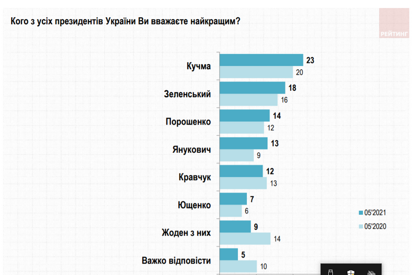 Загалом, серед усіх президентів незалежної України, як і минулого року, вважають найкращим Л. Кучму (23%). 18% відповіли, що найкращим Президентом є В. Зеленський, 14% вважають, що найкращим був П. Порошенко, 13% вважають, що найкращим був В. Янкукович, 12% - Л. Кравчук та лише 7% - В. Ющенко. Водночас, 9% відповіли, що жоден з них не був найкращим, ще 5% - не змогли відповісти.