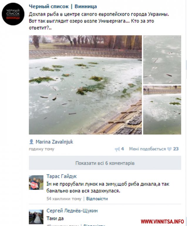 Натомість у соцмережах така ситуація викликала обурення громадян. Місцеві жителі коментують, що за тиждень можна було і виловити «могильник». Вінничани запевняють, що риба просто задихнулася через відсутність прорубаних ополонок для доступу повітря.