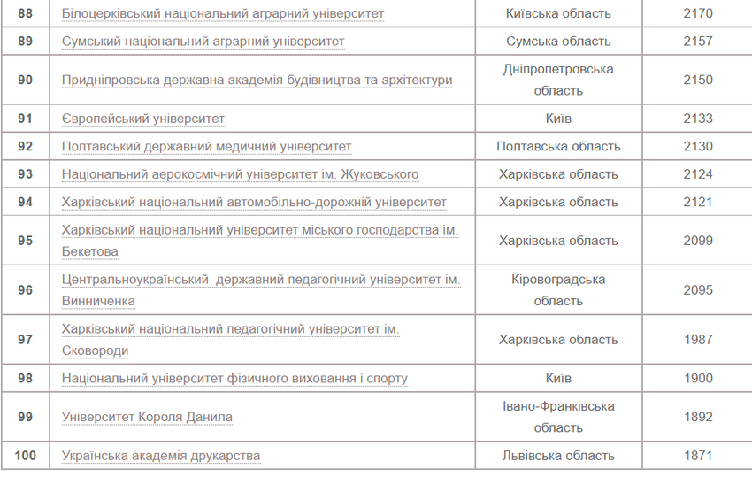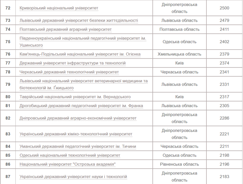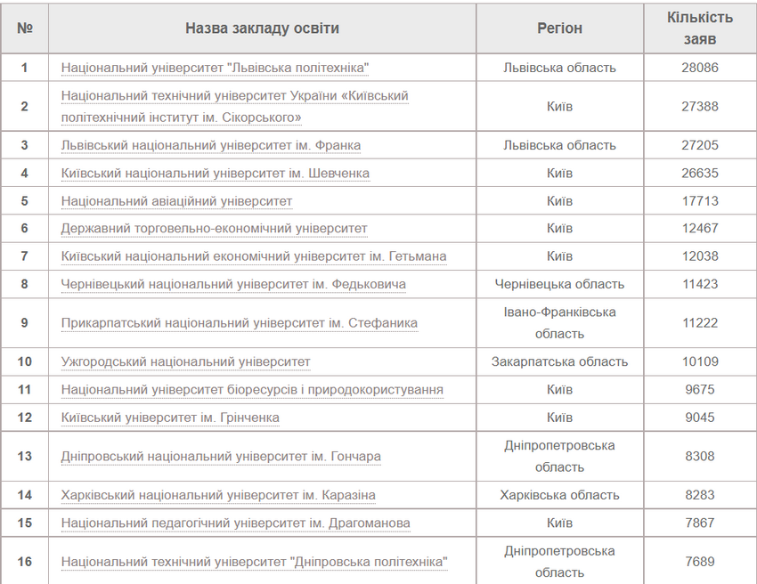 Цьогоріч лідером за кількістю заяв від абітурієнтів, які вступають на основі повної загальної середньої освіти, є Національний університет «Львівська політехніка». На другій сходинці розташувався Київський політехнічний інститут ім. Ігоря Сікорського. Третє місце – у Львівського національного університету ім. Івана Франка. Четверту сходинку посідає Київський національний університет ім. Тараса Шевченка, а п’яту – Національний авіаційний університет.
